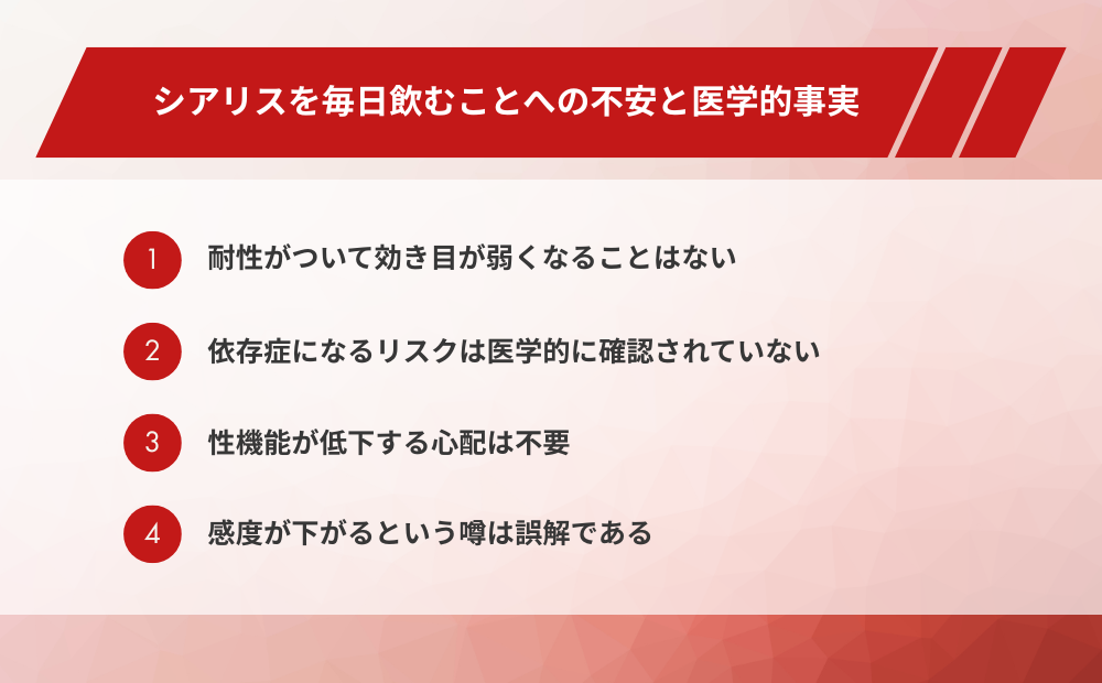シアリスの毎日服用について、さまざまな不安や疑問を持つ方がいます。ここでは代表的な4つの不安について、医学的事実をもとに解説します。