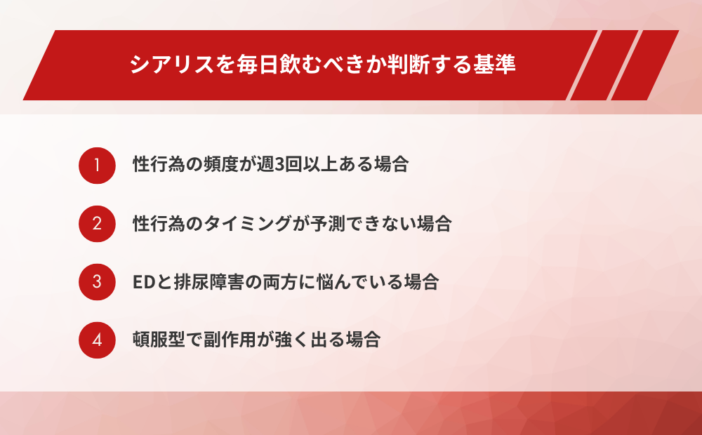 シアリスを毎日服用すべきかどうかは、個人の状況によって異なります。ここでは判断の参考となる4つの基準を紹介します。