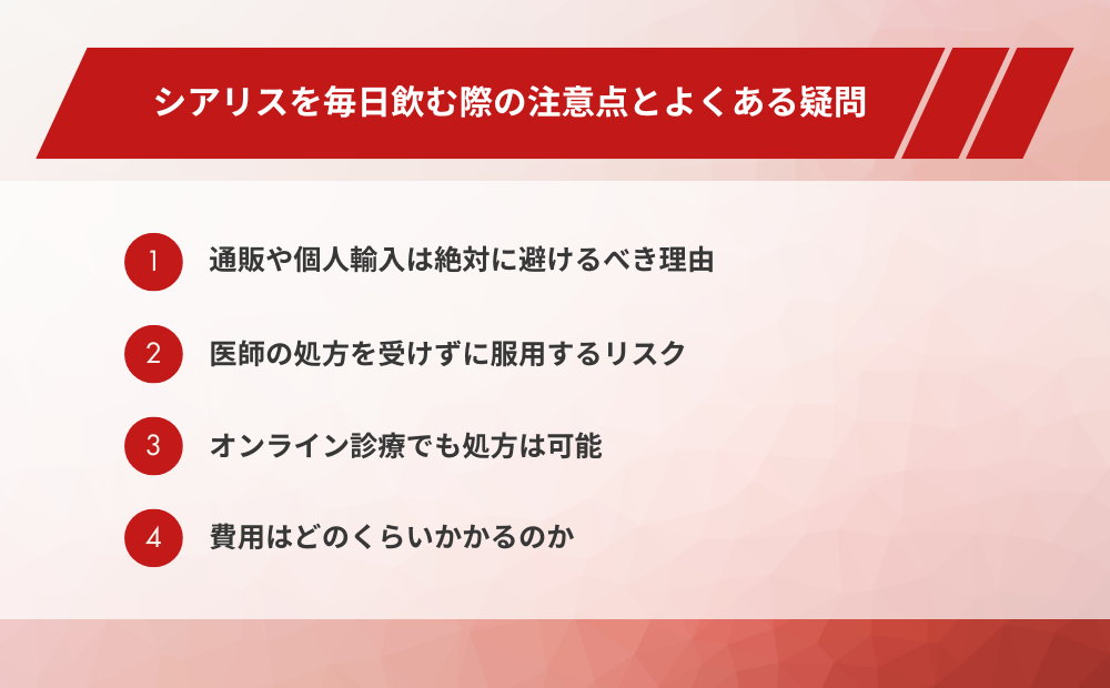 シアリスを毎日服用する際には、いくつか注意すべき点があります。ここでは安全に使用するための重要な情報をまとめました。