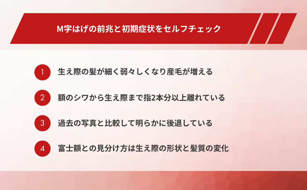 M字はげは初期段階では気づきにくく、「なんとなくおでこが広くなった気がする」という感覚から始まることが多いです。早期発見のためには、具体的なチェック方法を知っておくことが重要です。以下のポイントを参考に、自分の状態を確認してみましょう。