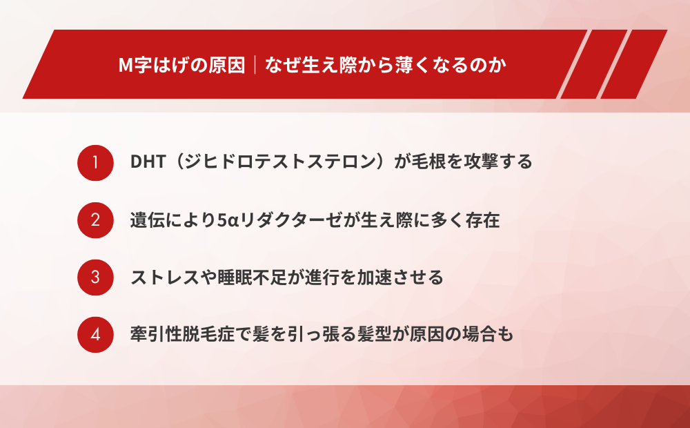 M字はげが額の両端から進行するのには、明確な生物学的な理由があります。遺伝・ホルモン・生活習慣・外的ダメージなど、複数の要因が絡み合っていることが多く、原因を正しく把握することが適切な対処につながります。