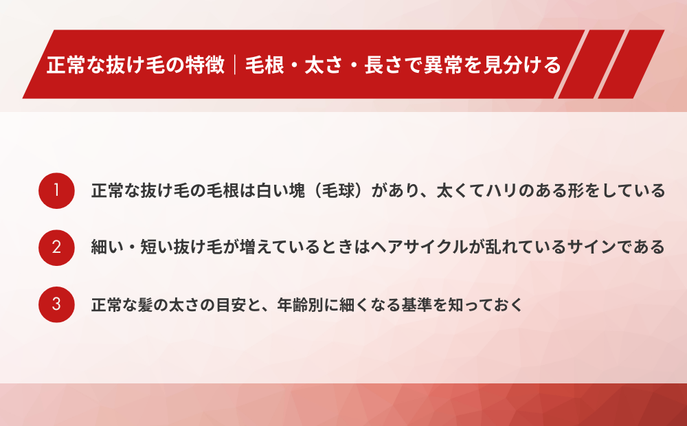抜け落ちた髪の毛の根元を観察することで、正常かどうかを確認できます。正常なヘアサイクルを経て自然に脱落した毛は、根元に白い丸い塊(毛球)があり、太くてハリのある形をしています。この白い部分は毛根が萎縮して脱落したサインであり、毛包自体は健全に残っている状態を意味しています。