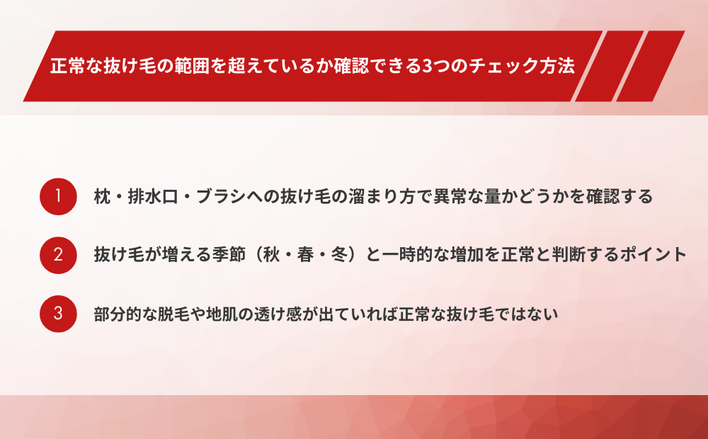 正常な抜け毛の範囲を超えているか確認できる3つのチェック方法