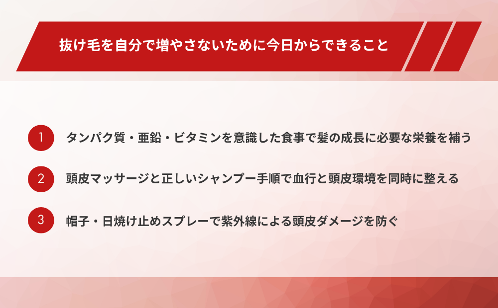 加齢による変化を完全に止めることはできませんが、生活習慣やヘアケアの見直しによって、抜け毛を必要以上に増やさないことは可能です。まずは今日からできることを少しずつ取り入れていきましょう。
