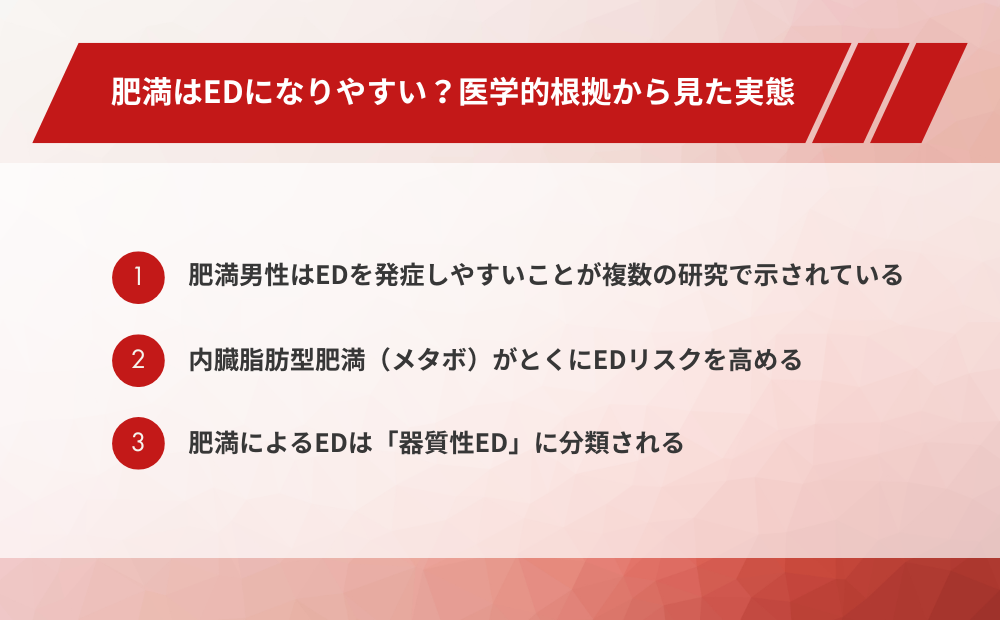 見た目の変化だけでなく、動脈硬化や男性ホルモンの低下、さらには糖尿病や睡眠時無呼吸症候群といった合併症を通じて、EDはじわじわと進行していく場合があります。本記事では、そのメカニズムから自己チェックの方法、ダイエットや治療の具体的な選択肢まで、医学的根拠をもとにわかりやすく解説します。「まだ大丈夫」と先延ばしにする前に、ぜひ一度ご自身の状態を確認してみてください。