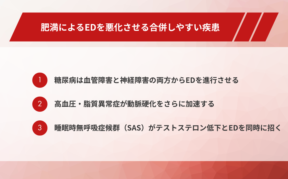 肥満はED単独の問題にとどまらず、他の疾患を介してEDをさらに悪化させるリスクがあります。糖尿病・高血圧・脂質異常症・睡眠時無呼吸症候群は、いずれも肥満との関係が深く、EDとの関連においても重要な疾患です。