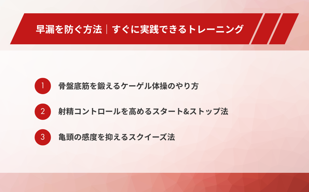 早漏の改善には、医療機関での治療だけでなく、自宅で手軽に実践できるトレーニング方法があります。ここでは、射精のコントロール能力を高める可能性のある3つの代表的なトレーニング方法をご紹介します。