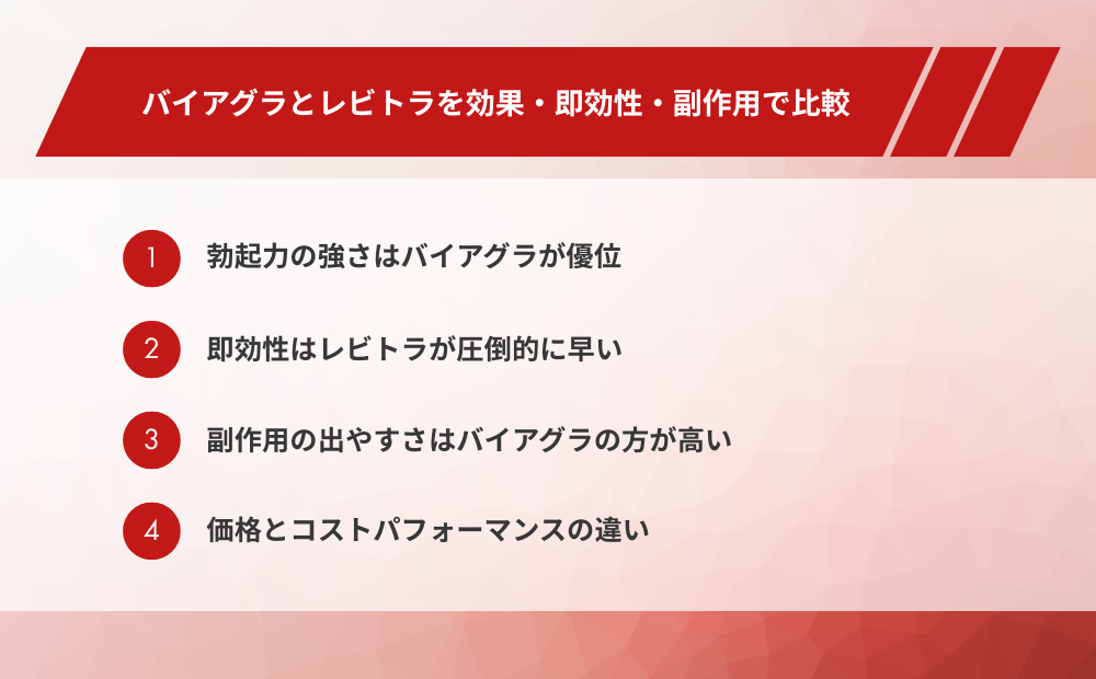 バイアグラとレビトラ(バルデナフィル)は、どちらもED治療薬として広く使用されていますが、効き方や使い勝手には明確な違いがあります。自分に合った薬を選ぶために、まずは主要な違いを把握しておきましょう。