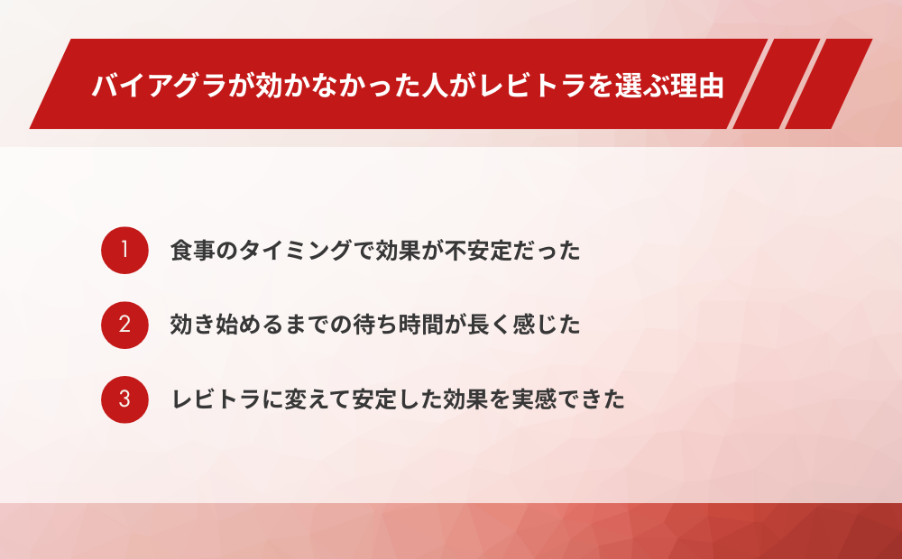 バイアグラからレビトラ(バルデナフィル)に切り替えた方からは、以下のような声が多く聞かれます。