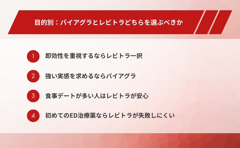 目的別:バイアグラとレビトラどちらを選ぶべきか